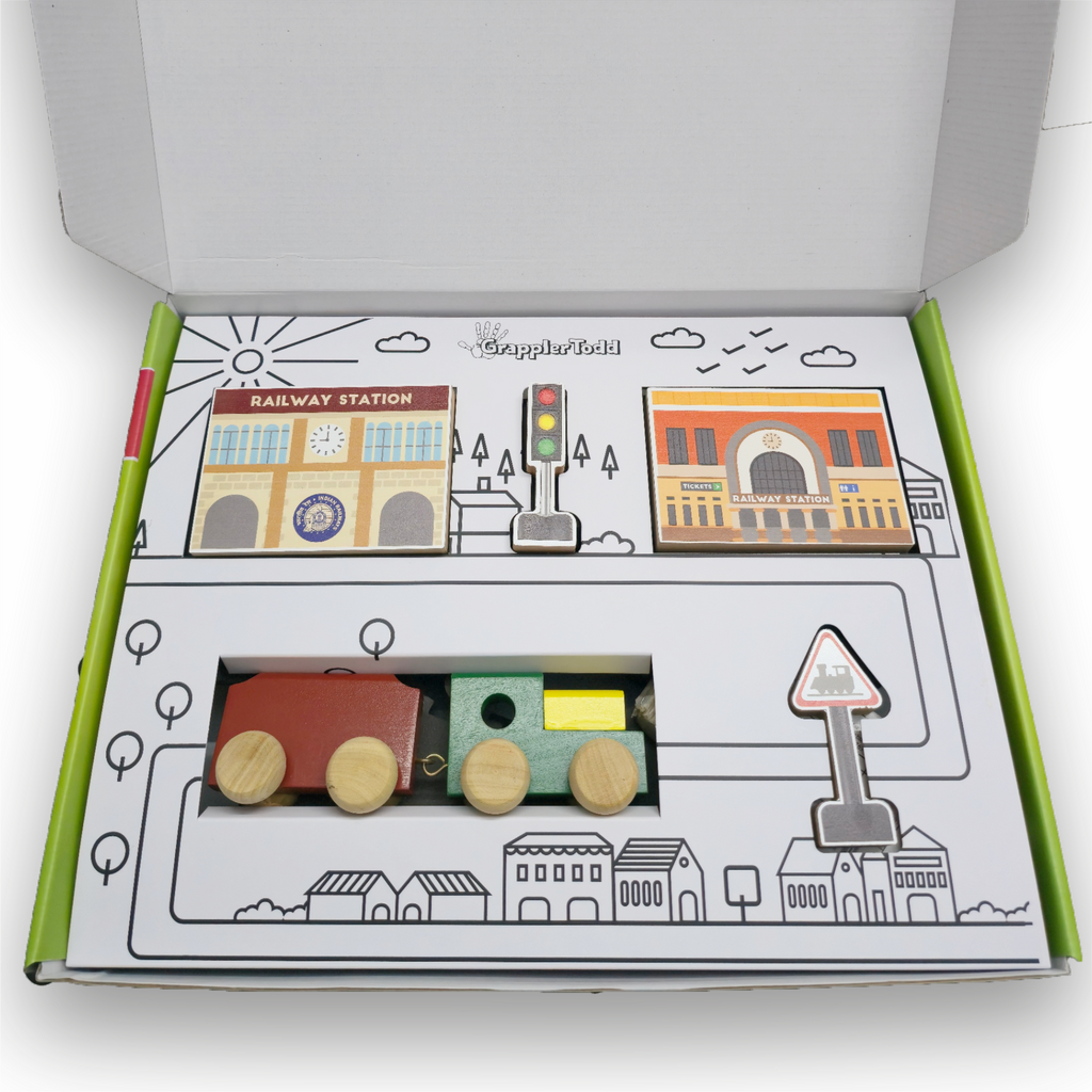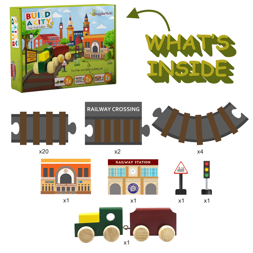 This set includes 26 EVA-foam interlocking track pieces, 2 wooden railway stations, 1 railway signal, 1 railway crossing sign, and 1 single-boogie wooden train to complete the adventure.